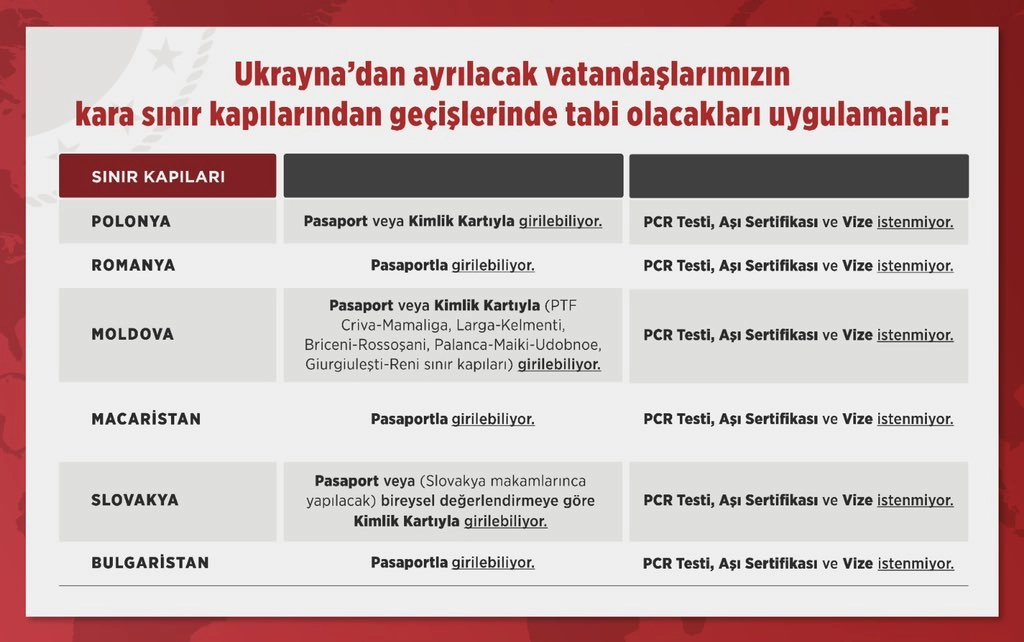 Dışişleri Bakan Yardımcısı Yavuz Selim Kıran, sosyal medya üzerinden Rusya'nın saldırıları dolayısıyla Ukrayna'dan ayrılacak Türk vatandaşlarının kara yolu geçişlerinde yararlanabilecekleri güncel bilgileri duyurdu.