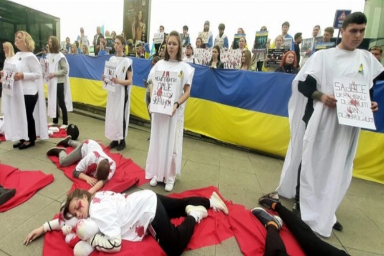 İstanbul’un Beyoğlu ilçesindeki Odakule Meydanı’nda 50 kişilik Ukraynalı grup, bugün Rusya protestosu gerçekleştirdi. Ukrayna bayraklarıyla protesto gösterisi yapan grup, “Putin’i durdurun, savaşı durdurun” sloganları attı. Ukrayna’daki sivillerin ölümüne dikkat çekilen protesto etkinliğinde Ukraynalı grup kefen giyerek kırmızıya boyandı. Protestocular, “Sadece Ukraynalı olduğum için öldürüldüm” yazılı pankartlar açtı. Özellikle Ukrayna’nın Buça (Bucha) kentindeki katliamı işaret eden Ukraynalı protestocular, üzerlerine giydikleri kanlı kıyafetle yere yatarak söz konusu görüntüleri akıllara getirdi.