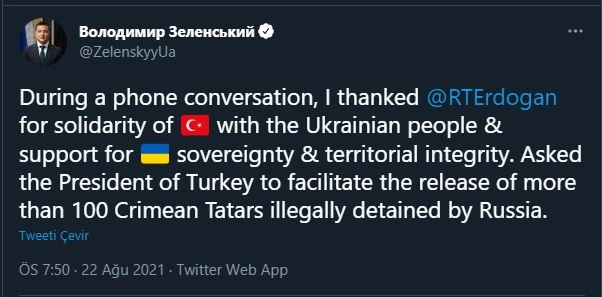 Zelenskıy, görüşmeleriyle ilgili olarak, "Bir telefon görüşmesi sırasında, Türkiye'nin Ukrayna halkıyla dayanışması ve Ukrayna'nın egemenliğine ve toprak bütünlüğüne verdiği destek için Recep Tayyip Erdoğan'a teşekkür ettim. Türkiye Cumhurbaşkanı'ndan Rusya tarafından yasadışı olarak gözaltına alınan 100'den fazla Kırım Tatarının serbest bırakılmasını kolaylaştırmasını istedim." ifadelerinde bulundu.