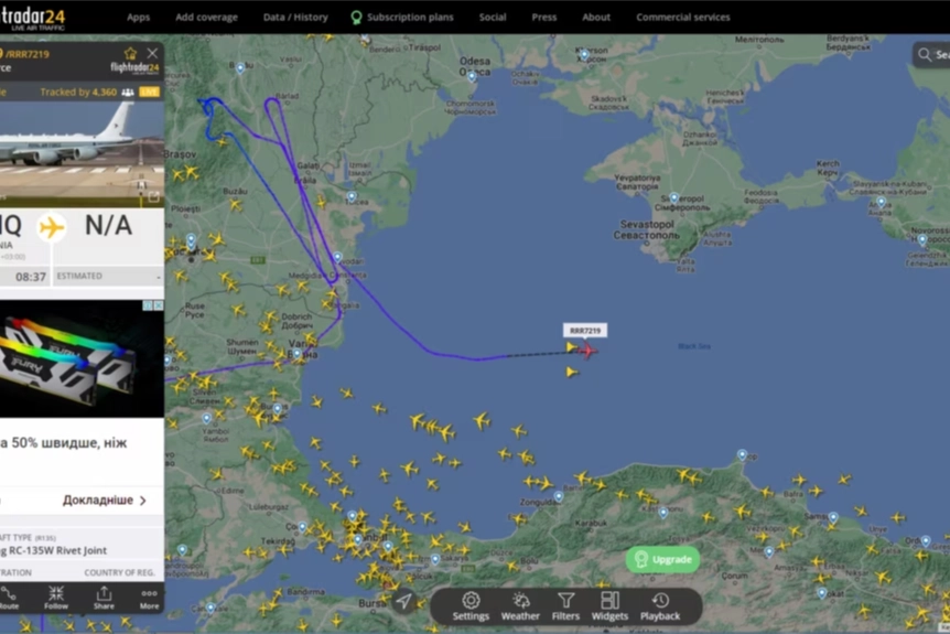Flightradar, Kırım açıklarında iki Eurofighter Typhoon FGR.4 savaş uçağının eşlik ettiği Birleşik Krallık’a ait Boeing RC-135W Rivet Joint keşif uçağı görüldüğünü duyurdu.