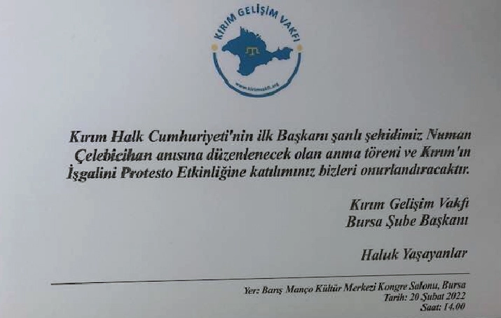 Kırım Gelişim Vakfı Bursa Şubesi, Kırım Halk Cumhuriyeti'nin ilk başkanı, Kırım Tatar halkının antlı şehit olarak gördüğü Numan Çelebicihan'ın şehadetinin yıl dönümü ile Kırım'ın 2014 yılında Rusya tarafından işgal edilmesinin yıldönümünde anma programı ve protesto etkinliği gerçekleştirecek. 20 Şubat 2022 tarihi saat 14.00'te yapılacak olan etkinliği Kırım Gelişim Vakfı Bursa Şube Başkanı Haluk Yaşayanlar duyurdu. Haluk Yaşayanlar, Türkiye Cumhuriyeti yetkilileri, Türkiye'deki Kırım Tatar diasporası ve Ukrayna Büyükelçiliği yetkililerinin katılımlarının beklendiğini duyurdu.