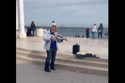Rus işgalci yönetiminin Ukrayna yanlısı tutum için Kırımlılara uyguladığı baskılara rağmen Ukrayna yanlısı kadın Kezlev’in turistik yerlerinden birinde hoparlörden Ukrayna milli marşını açarak ona kemanla eşlik etti.