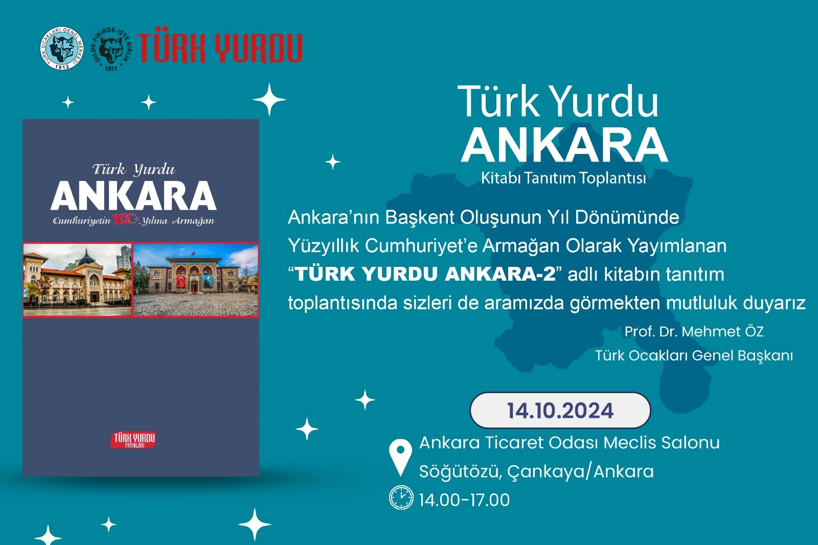 Türk Ocakları Genel Merkezi ise "Türk Yurdu Ankara-2" adlı kitabın tanıtım toplantısını gerçkleştirecek. Ankara'nın başkent oluşunun yıl dönümüne özel olarak icra edilecek kitap tanıtım toplantısı 14 Ekim 2024 tarihinde Ankara Ticaret Odası Meclis Salonu'nda yapılacak. "Türk Yurdu Ankara Kitabı Tanıtımı Toplantısı" saat 14.00 ile 17.00 arasında tertip edilecek.
