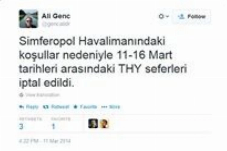 Türk Hava Yolları, Kırım'da referandumun yapılacağı 16 Mart'a kadar tüm Akmescit (Simferopol) seferlerini iptal ettiğini duyurdu.THY Basın Danışmanı Ali Genç Twitter hesabı üzerinden yaptığı açıklamada Ukrayna'daki diğer şehirlere düzenlenen seferlerin ise sorunsuz bir şekilde devam etmekte olduğunu bildirdi.Akmescit Havalimanına halen sadece Kiev ve Moskova'dan seferler yapılıyor.