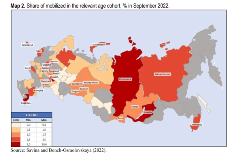 Rusya, Ukrayna'da seferber edilen ve askere alınan askerlerin sayısı veya savaşta ölenlerin sayısı hakkında bilgi yayınlamıyor. Finlandiya Bankası Gelişmekte Olan Ekonomiler Enstitüsü (BOFIT) Kıdemli Danışmanı Laura Solanko, Rusya'nın seferberlik sırasında insan tercihini nasıl değerlendirdiği hususunda önemli bir araştırmaya imza attı. Solanko, 21 Şubat tarihinde "Rusya'nın Seferber Edilmiş Askerleri Nereden Geliyor? Banka Mevduatlarından Kanıtlar" başlıklı bir yazı yayımladı.