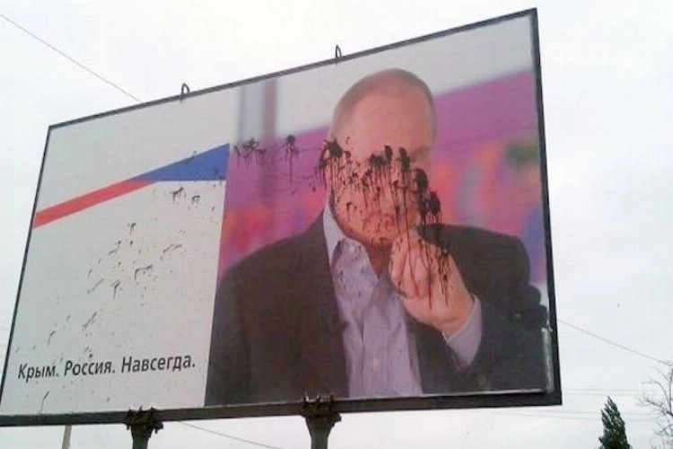 Rus işgali altındaki Kırım’ın Kerç şehrinde bulunan semtlerden birinde, Rusya’nın Kırım’a yönelik politikası ile ilgili yazı ve Rusya Devlet Başkanı Vladimir Putin'in resmi bulunan büyük reklam panosuna boya döküldü. Olay, Kerç’in kalabalık Voroşilov sokağında bulunan bir market yakınında meydana geldi.