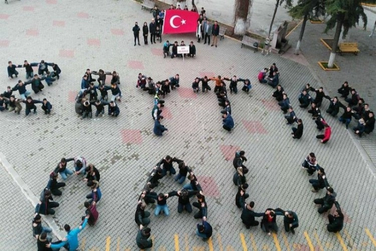 Balıkesir İmam Hatip Lisesi'nde yaklaşık 50 öğrenci, okulun bahçesinde bir araya gelerek "Zeytin Dalı Harekatı" koreografisi oluşturdu.