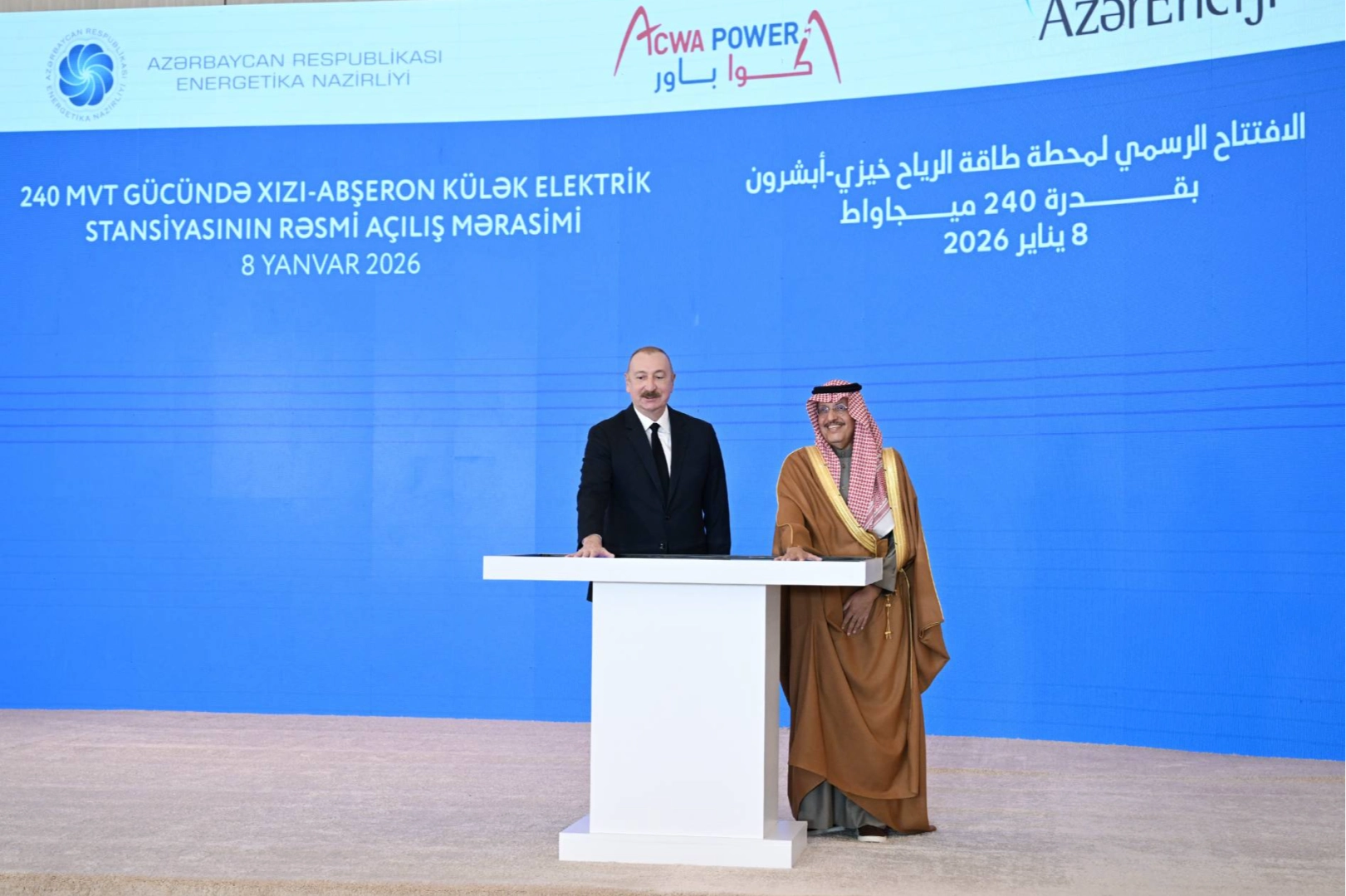 Azerbaycan’da 240 megavat kurulu güce sahip "Hızı-Abşeron Rüzgar Enerjisi Santrali", 8 Ocak 2026 tarihinde Gülistan Sarayı'nda düzenlenen törenle hizmete açıldı. Suudi Arabistan merkezli ACWA Power şirketi tarafından inşa edilen santralin Bakü’deki açılış törenine Azerbaycan Cumhurbaşkanı İlham Aliyev de katıldı.