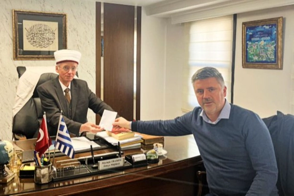 İskeçe Seçilmiş Müftüsü Mustafa Trampa'yı ziyaret eden Belediye Başkanı Delihüseyin, eşinin ve kendisinin umre parasını Türkiye'deki depremzedelere bağışladı.