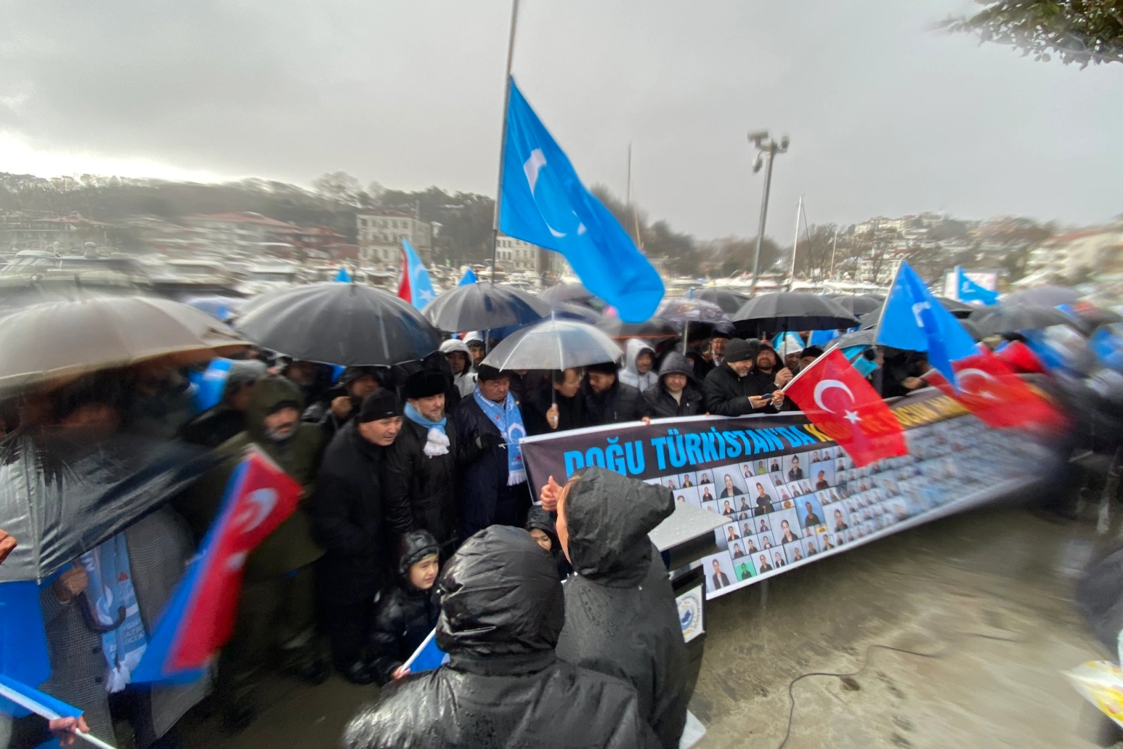 Çin'in İstanbul Başkonsolosluğu önünde toplanan kalabalık havanın yağmurlu olmasına rağmen Çin yönetimi tarafından 5 Şubat 1997 Gulca'da şehit edilen soydaşları için hep bir ağızdan Pekin yönetimini kınadı.