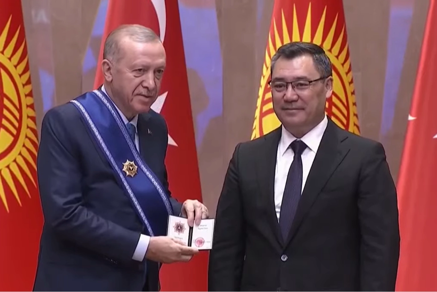 Türk Devletleri Teşkilatı (TDT) 11. Liderler Zirvesi için Kırgızistan'a giden Türkiye Cumhuriyeti Cumhurbaşkanı Recep Tayyip Erdoğan 5 Ekim 2024 tarihinde, Bişkek'te Kırgızistan Cumhurbaşkanı Sadır Caparov ile Anlaşmaların İmza Töreni, Manas Nişanı Takdimi ve Ortak Basın Toplantısı'na katıldı.