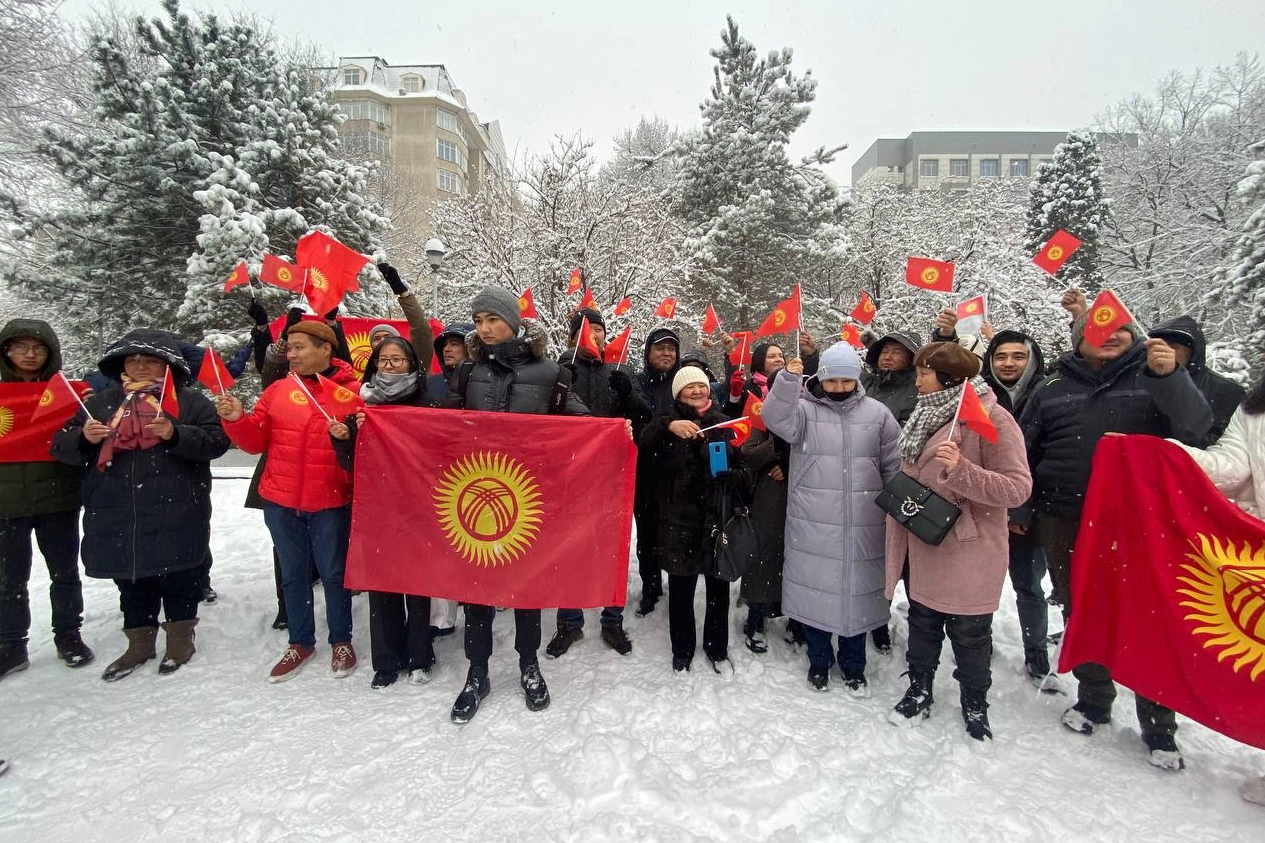 Protesto, Bişkek'teki Maksim Gorki Parkı'nda düzenlendi. Yoğun kar yağışı ve soğuğa karşı aldırış etmeyen 50'den fazla protestocu, ellerinde Kırgızistan bayrağı ve resimleriyle "Bayrağa dokunmayın" sloganları attı.