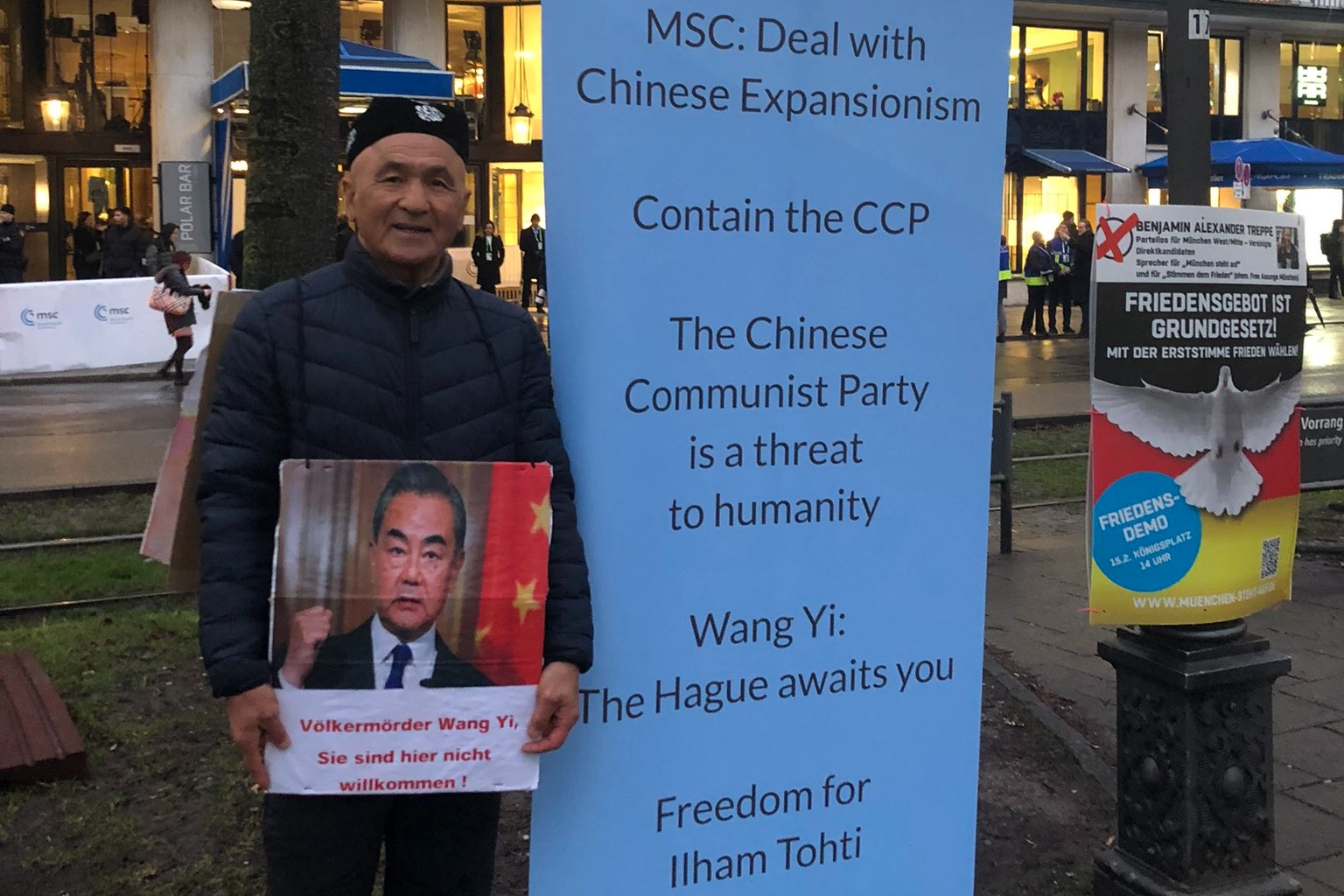 Doğu Türkistan bayraklarıyla gerçekleştirilen protesto etkinlğinde konuşan Dünya Uygur Kongresi Başkanı Turguncan Alawudun, “Çin bugün dünya için büyük bir tehdittir; küresel ekonomiye ve barışa zarar veriyor. Uygurlara, Tibetlilere, Moğollara ve diğer Çinli olmayan halklara baskı yapıyor, özellikle Uygurlara karşı sert soykırım politikaları uyguluyor. Bu koşullar altında, Çin Dışişleri Bakanı'nın küresel bir güvenlik konferansına katılması mantıksızdır.” ifadelerini kullandı.