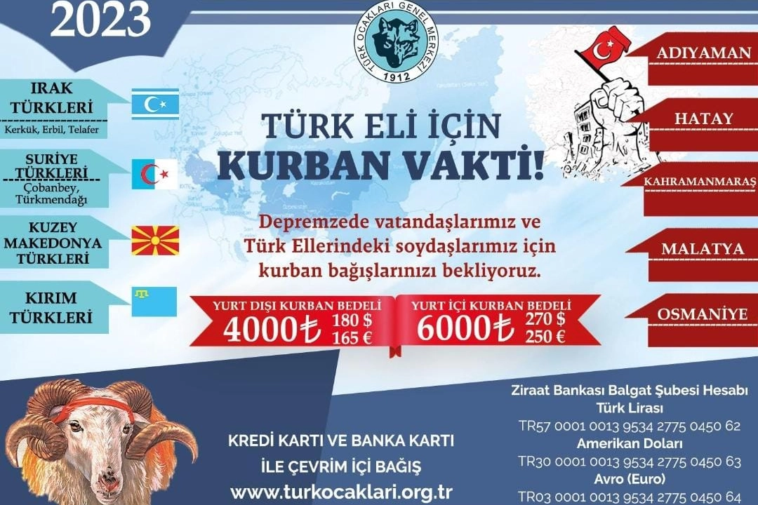 Toplanan yardımlarla Türkiye'de ağır yıkımların yaşandığı 6 Şubat Kahramanmaraş depremlerinden zarar gören Hatay, Adıyaman, Kahramanmaraş, Malatya ve Osmaniye'ye bağış yapılacak. Ayrıca Türk dünyası için harekete geçen Türk Ocakları Genel Merkezi; Irak Türkleri, Suriye Türkleri, Kuzey Makedonya Türkleri ve Kırım Türkleri için yardım toplayacak. Genel Merkezden verilen bilgiye göre, yurt dışı kurban bedeli 4 bin Türk Lirası (TL), yurt içi kurban bedeli 6 bin TL olarak belirlendi.
