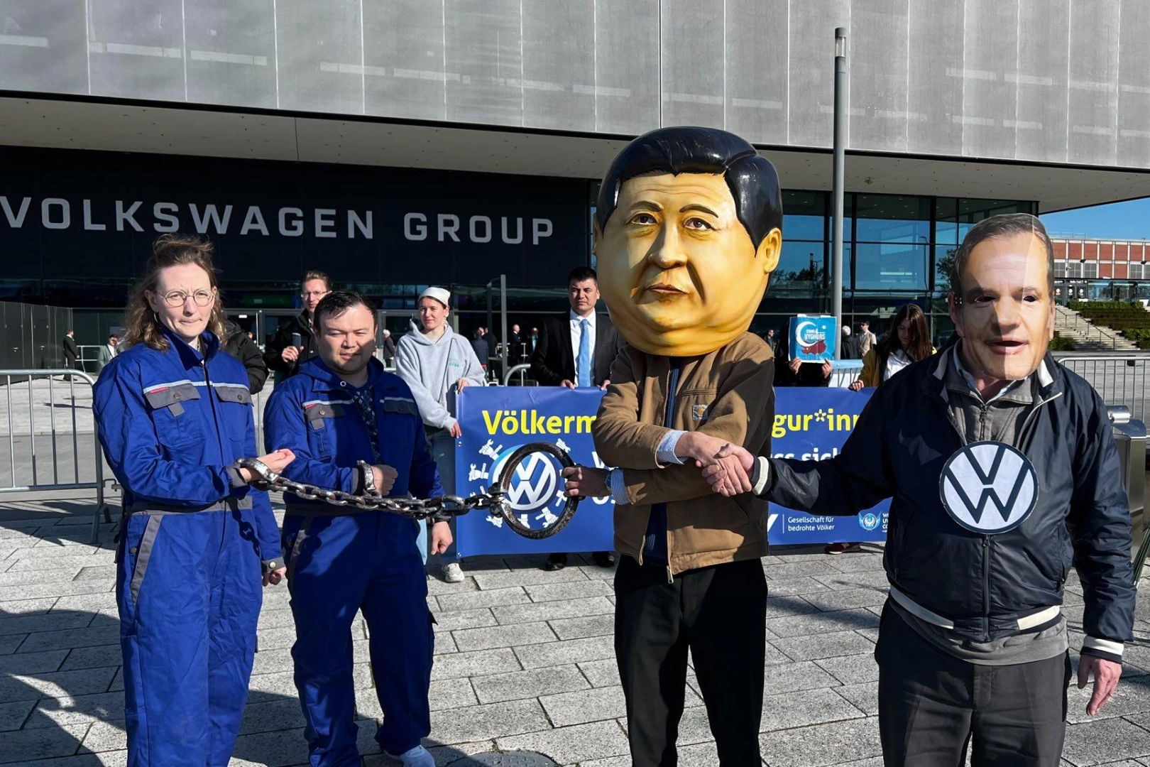 Almanya'nın başkenti Berlin'de bugün Uygur Türkü ve Alman insan hakları aktivistleri, Çin işgali altındaki Doğu Türkistan'da Uygur Türklerinin emeğini sömüren ünlü markalardan biri olan Volkswagen'i şirket binası önünde protesto etti. Ünlü markanın yıllık genel kurul toplantısı öncesinde bir araya gelen aktivistler, ellerinde pankartlar ile Çin diktatörü Şi Cinping'in kafasının kuklasını taşırken Volkswagen şirketinin ceosu Thomas Schafer'ın maskesini taktı. Maske takanların ellerine sıkıştırılan zincirler, tek tip işçi kıyafeti giydirilmiş Uygur Türklerinin ellerinin ve kollarının bağlı olduğuna dikkat çekti.