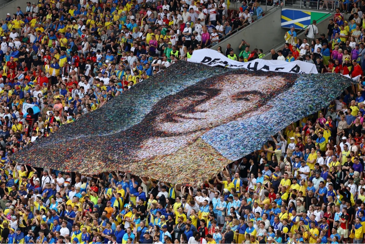 "Barışın bir bedeli vardır" yazılı pankartta yer alan Nazariy Grıntsevıç'in fotoğrafı ise, Ukrayna futbol kulüplerinin taraftarı olan ve Rus saldırılarında hayatını kaybeden 182 Ukraynalı askerin fotoğraflarının kolajıyla oluşturuldu.