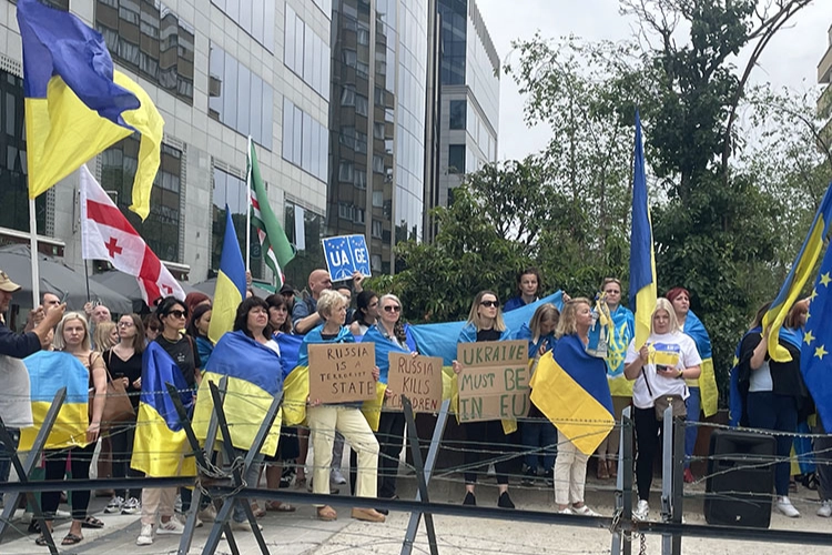 Protestocular, "Ukrayna, AB ve NATO üyesi olmalı", "Rusya, terörist bir devlettir", "Nükleer terörü durdurun", "Rusya, çocukları öldürüyor" yazılı pankartlar açarak uzun süre siren sesi çaldı.