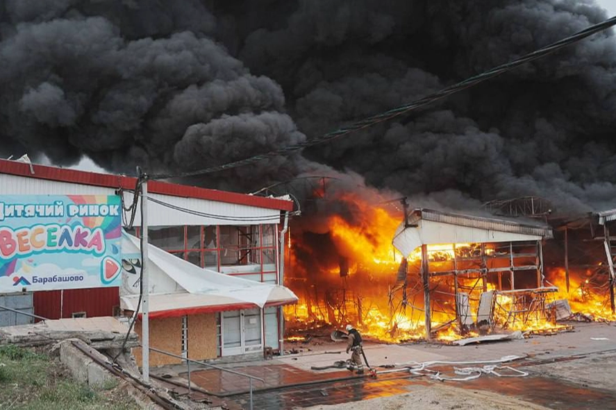 Belediye başkanının aktardığına göre, Rus SİHA’larından biri Ukrayna'nın en büyük ve dünyanın 14. büyük pazarı olan Barabaşovo Pazarı’na isabet etti. Pazar yerinde büyük yangın çıktı, alevler ticaret alanlarını sardı.