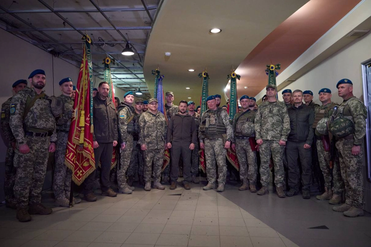 Deniz piyadeleriyle bir araya gelen Zelenskıy askerlere ödüllerini takdim etti.
