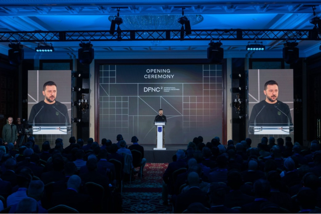 Ukrayna Cumhurbaşkanı Volodımır Zelenskıy,1 Ekim 2024 tarihinde gerçekleşen İkinci Uluslararası Savunma Sanayi Forumu'nun (DFNC2) açılışında konuştu. Cumhurbaşkanı Zelenskıy, Rusya'nın saldırıları devam ederken ve tam ölçekli bir savaşın zor koşulları altındayken Ukrayna'nın fiilen yeni bir savunma sanayi kurmayı başarmasına değindi. Yıllar önce Ukrayna'nın zayıf bir savunma sanayisine sahip olduğunu belirten Zelenskıy, bugün Ukrayna'nın Avrupa'da liderlik yolunda ilerlediğini vurguladı.