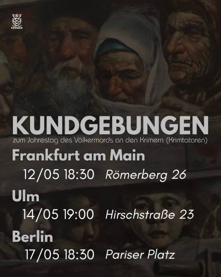 Almanya'da bulunan Kırım Tatar diasporası, 12 Mayıs'ta Frankfurt'ta, 14 Mayıs'ta Ulm'da ve 17 Mayıs'ta Berlin'de dayanışma göstermek ve tarihsel adalet için ayağa kalkmak üzere bir araya gelecek.