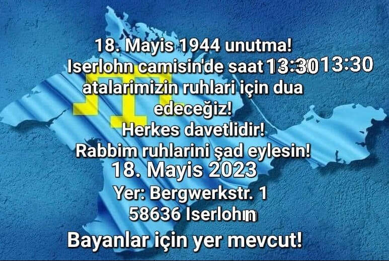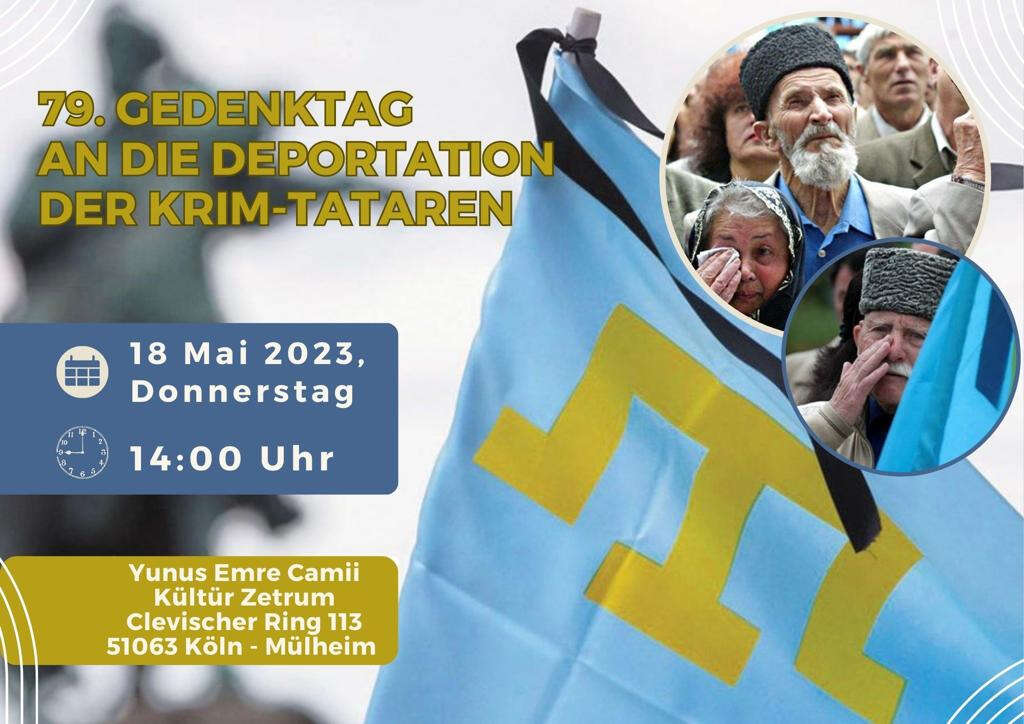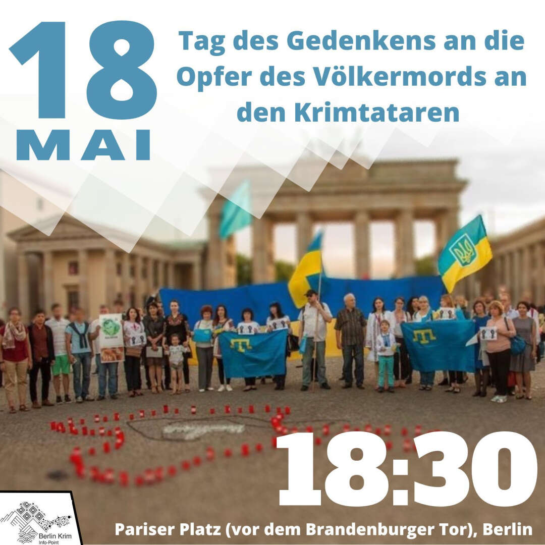 Almanya'da yaşayan Kırım Tatar diasporası ülkedeki 3 farklı şehirde anma programı düzenleyecek. Büyük Kırım Tatar Sürgünü'nün 79. yıldönümü olan 18 Mayıs günü, Kırım Tatarları; başkent Berlin'de 18.30'da, Köln'de saat 14.00'te, Iserlohn'de saat 13.30'da toplanacak. Kırım Tatarları, Berlin'deki program için Pariser Platz (vor dem Branderburger Tor) Meydanı'nda bir araya gelecek.