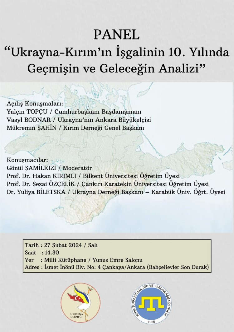 Kırım Derneği ve Ukrayna Derneği ortaklığında, 27 Şubat 2024'te saat 14.30’da Ankara Millî Kütüphane’de "Ukrayna-Kırım İşgalinin 10. Yılında Geçmişin ve Geleceğin Analizi" konulu panel düzenlenecek.