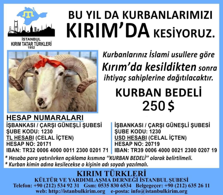 Kırım Derneği İstanbul Şubesi Kırım'da kesilen kurbanların ihtiyaç sahiplerine dağıtılacağı ifade edildi. Duyuruda, "Kurbanlarınız İslamî usullere göre Kırım'da kesildikten sonra ihtiyaç sahiplerine dağıtılacaktır" ifadesi yer aldı. Kurbanların bedeli ise 250 ABD doları olarak duyuruldu.
