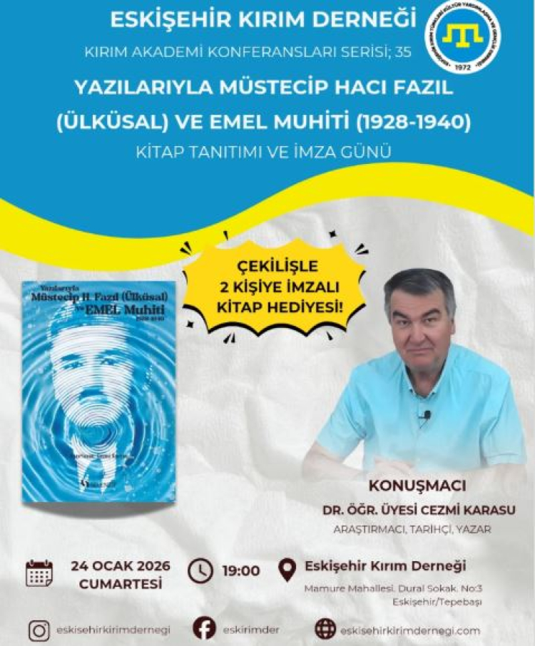 Eskişehir Kırım Derneği, Kırım Akademi Konferansları kapsamında "Yazılarıyla Hacı Fazıl Müstecip (Ülküsal) ve Emel Muhiti (1928-1940)" isimli kitabın kaleme alan Araştırmacı, Tarihçi, Yazar Dr. Öğretim Üyesi Cezmi Karasu'yu konuk edecek.