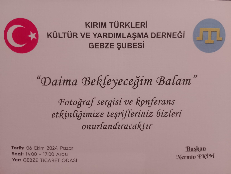 Kırım Tatar Sürgünü dolayısıyla yurdundan koparılan ve işgalci Rusya tarafından haksız yere alıkonulan Kırım Tatarlarının içinde bulunduğu durum ile çocuklarından ayrı kalan Kırım Tatar anneleri anlatan "Daima Bekleyeceğim, Balam" isimli foroğraf sergisi ve konferans, İstanbul'un ardından 6 Ekim 2024 tarihinde Kırım Türkleri Kültür ve Yardımlaşma Derneği Gebze Şubesi aracılığıyla gerçekleştirilecek.