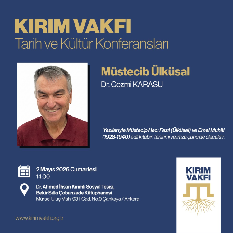 Kırım Vakfı tarafından her ayın ilk cumartesi günü tertip edilen “Tarih ve Kültür Konferansları” kapsamında 2 Mayıs 2026 tarihinde Dr. Cezmi Karasu, Müstecib Ülküsal’ı anlatacak.