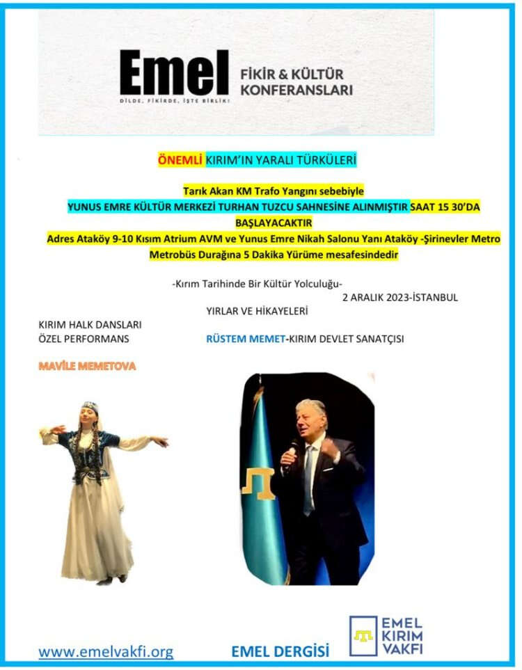 Kırım Devlet Sanatçısı Rüstem Memet, "Kırım'ın Yaralı Türküleri/Kırım Tarihinde Bir Kültür Yolculuğu" isimli 2 Aralık 2023 tarihli etkinlikte katılmıcıların kulaklarının pasını silecek. Mavile Memetova ise Kırım Tatar halk dansları performansını sergileyecek. Etkinilk, İstanbul Ataköy'deki Tarık Akan Kültür Merkezindeki yangın nedeniyle Yunus Emre Kültür Merkezi Turhan Tuzcu Sahnesi'ne alındı. Program, saat 15.30'da başlayacak.
