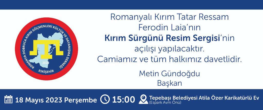 Eli kanlı Sovyet diktatörü Stalin'in emriyle 18 Mayıs 1944'te sürgün edilen Kırım Tatarlarını anmak için Eskişehir'de Romanya Dobruca Kırım Göçmenleri Kültür ve Dayanışma Derneği tarafından resim rergisi düzenlenecek. Romanyalı Kırım Tatar ressam Ferodin Laia'nın "Kırım Sürgünü Resim Sergisi" Eskişehir Tepebaşı Belediyesi Atila Özer Karikatürlü Ev önünde saat 15.00'de gerçekleşecek.