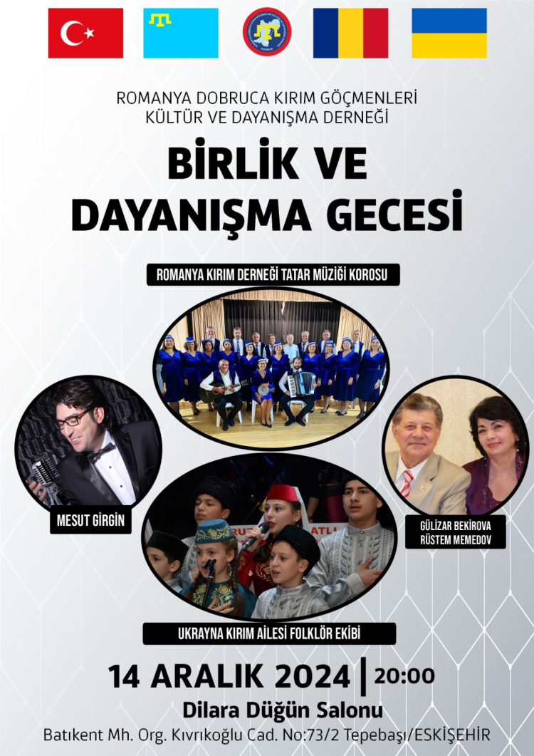 Romanya Dobruca Kırım Göçmenleri Kültür ve Dayanışma Derneğinin organizasyonuyla 14 Aralık 2024 tarihinde Eskişehir'de Birlik ve Dayanışma Gecesi tertip edilecek.