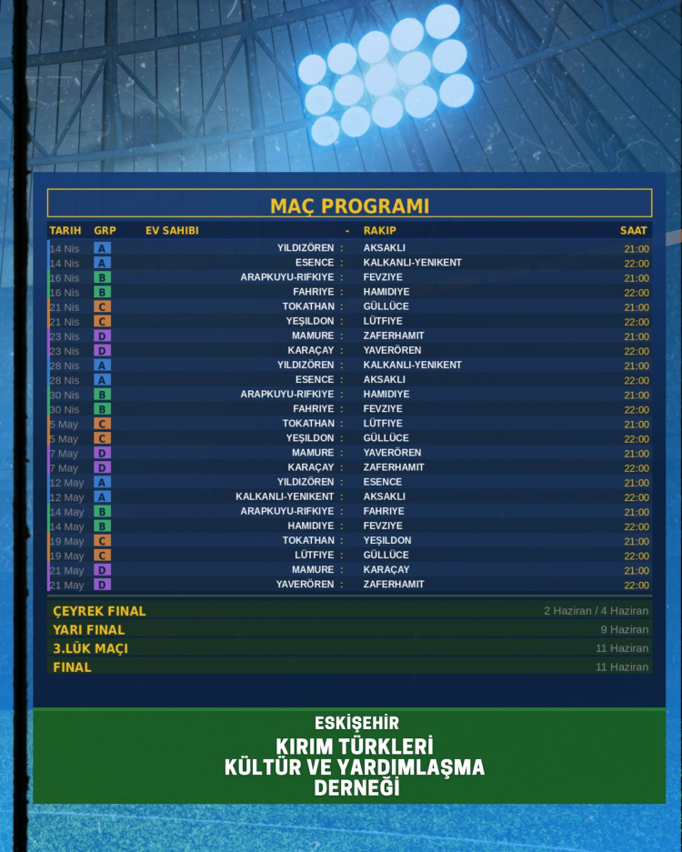 Eskişehir Kırım Türkleri Kültür ve Yardımlaşma Derneği Başkanı Recep Şen, Tepreş Futbol Turnuvası’nın 14 Nisan 2026 tarihinde başlayacağını Kırım Haber Ajansına (QHA) bildirerek, gerçekleşecek futbol karşılaşmalarını değerlendirdi.