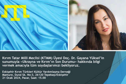 Kırım Tatar Milli Meclisi (KTMM) Üyesi Doç. Dr. Gayana Yüksel’in konuşmacı olarak katılacağı program, 21 Ocak 2024 Pazar günü saat 15.00'de Eskişehir Kırım Derneğinde gerçekleştirilecek.