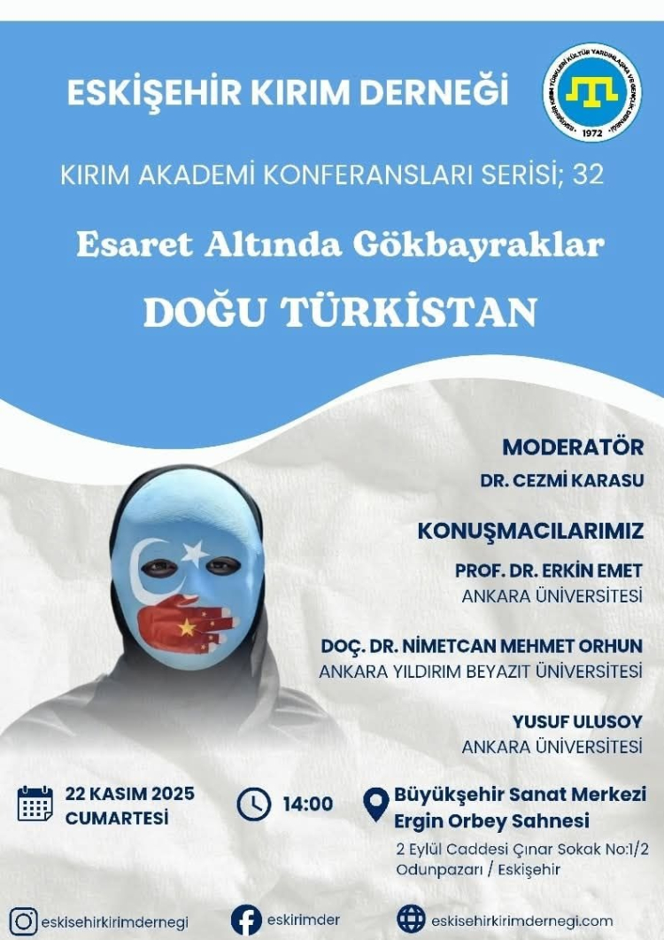 Eskişehir Kırım Derneği tarafından düzenlenen "Kırım Akademi Konferansları" kapsamında 22 Kasım'da “Esaret Altında Gökbayraklar: Doğu Türkistan” başlıklı program tertip edilecek.