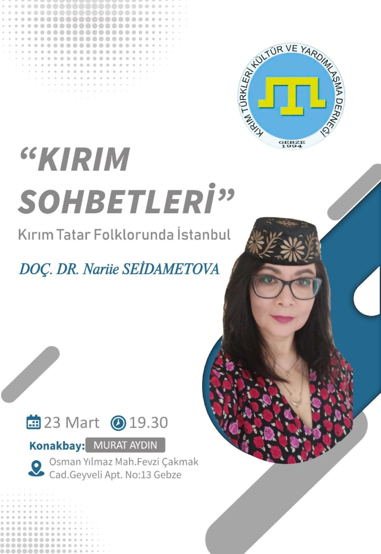 Kırım Derneği Gebze Şubesi, 23 Mart 2025 tarihinde Doç. Dr. Nariye Seydametova'nın (Nariie Seidametova) konuşmacı olarak katılacağı "Kırım Tatar Folklorunda İstanbul" konulu konferansa ev sahipliği yapacak.