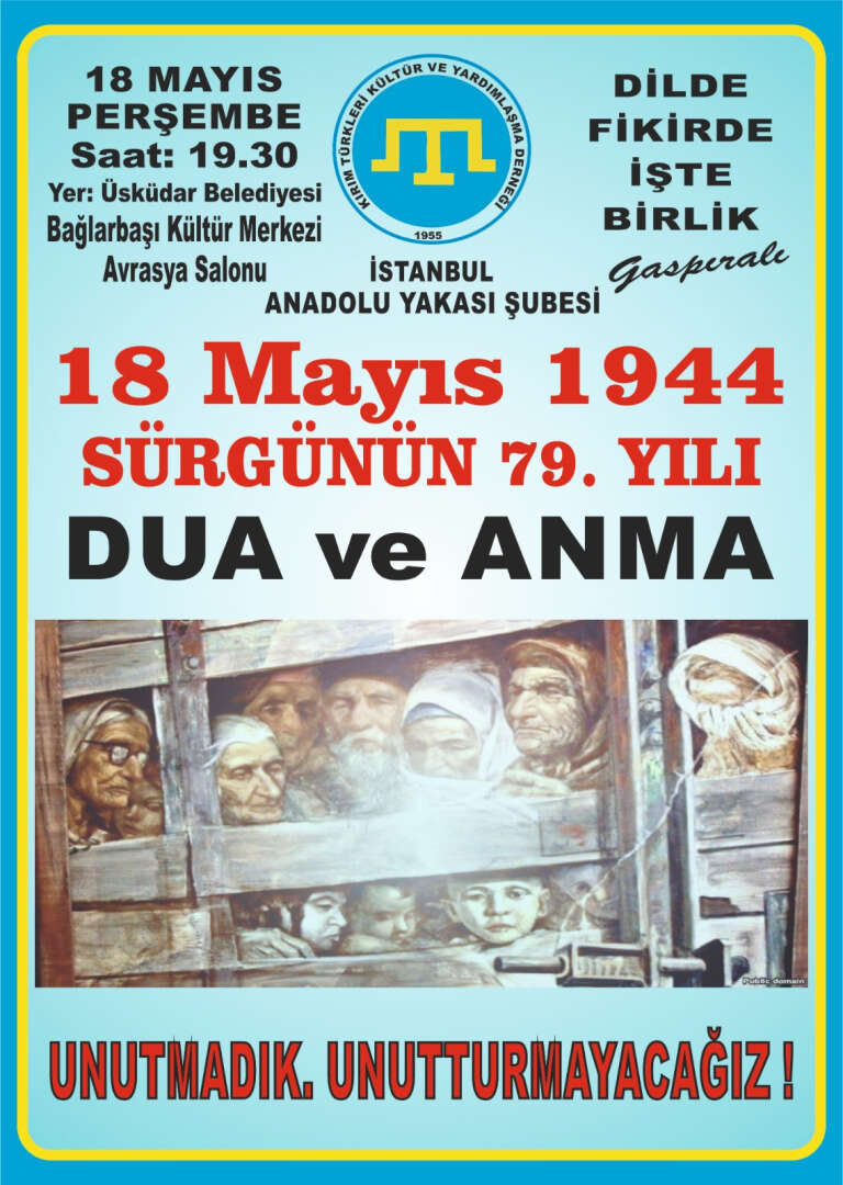 Kırım Türkleri Kültür ve Yardımlaşma Derneği İstanbul Anadolu Yakası Şubesi, 18 Mayıs 1944'teki büyük Kırım Tatar Sürgünü'nün 79. yıldönümünde dua ve anma programı düzenleyecek. Etkinlik, 18 Mayıs 2023 Perşembe günü saat 19.30'da Üsküdar Belediyesi Bağlarbaşı Kültür Merkezi Avrasya Salonu'nda yapılacak.