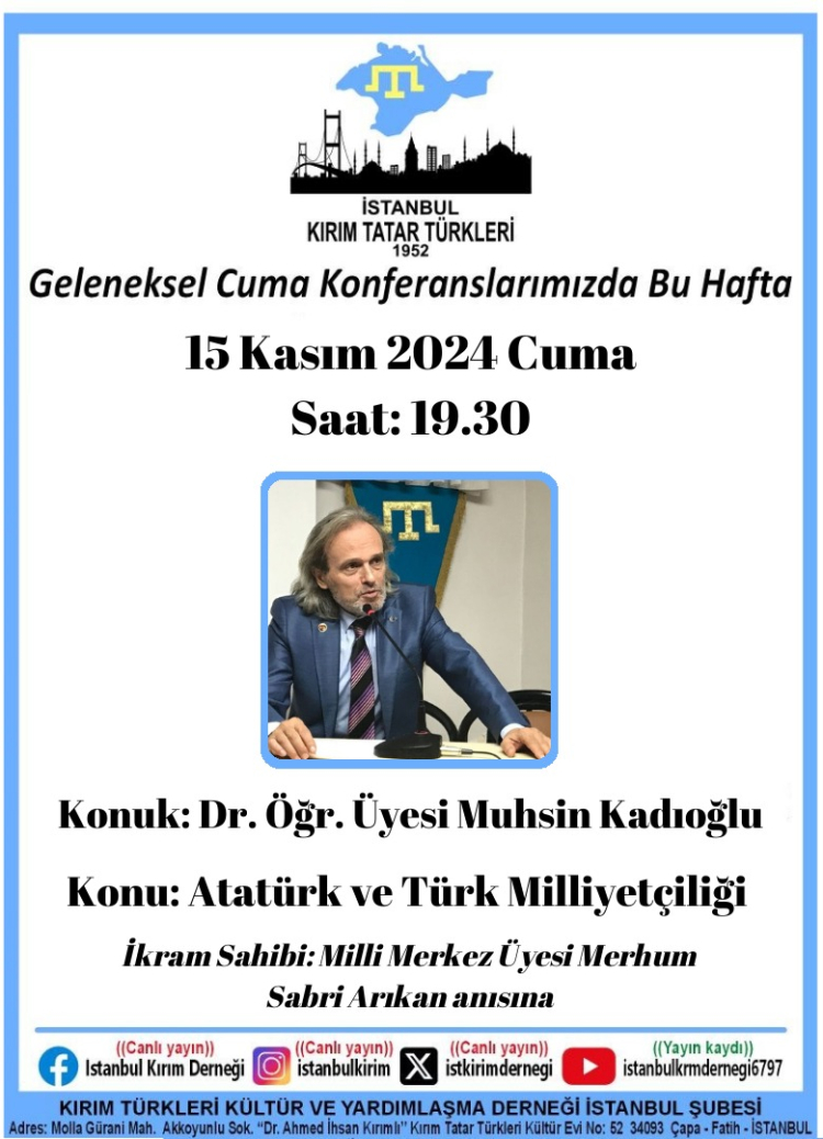 Kırım Derneği İstanbul Şubesi, 15 Kasım 2024 tarihinde Dr. Öğr. Üyesi Muhsin Kadıoğlu'nun konuşmacı olarak katılacağı "Atatürk ve Türk Milliyetçiliği" konulu konferansa ev sahipliği yapacak.