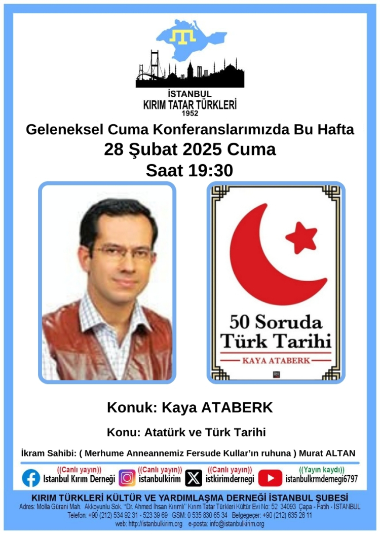 Kırım Derneği İstanbul Şubesi, 28 Ocak 2025 tarihinde Kaya Ataberk'in konuşmacı olarak katılacağı "Atatürk ve Türk Tarihi" konulu konferansa ev sahipliği yapacak.