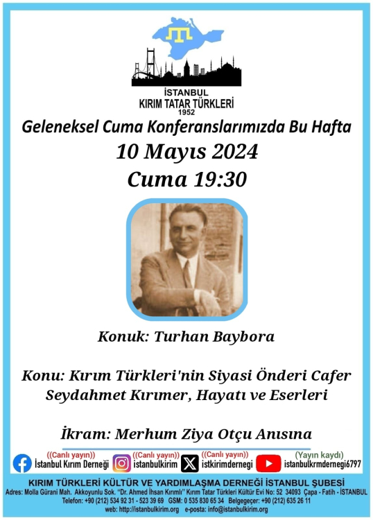 Kırım Türkleri Kültür ve Yardımlaşma Derneği İstanbul Şubesinin geleneksel olarak her hafta düzenlediği konferanslarda bu hafta "Kırım Türklerinin Siyasi Önderi Cafer Seydamet Kırımer, Hayatı ve Eserleri" konusu işlenecek.