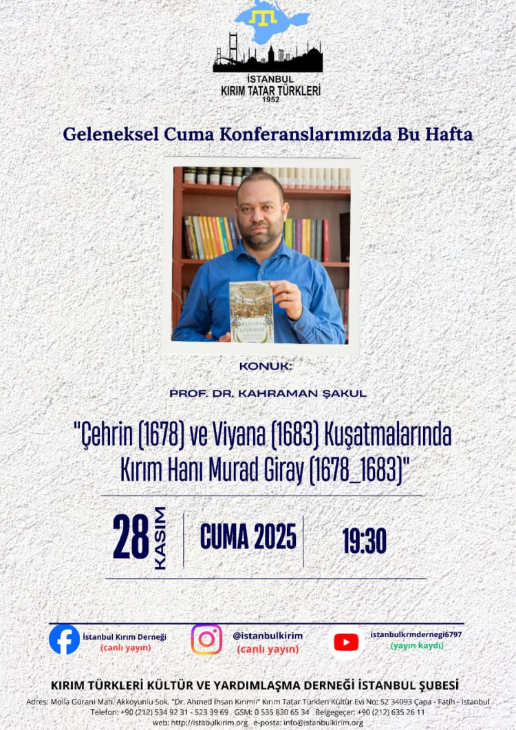 Kırım Derneği İstanbul Şubesi, 28 Kasım 2025 tarihinde Prof. Dr. Kahraman Şakul'un konuşmacı olarak katılacağı "Çehrin ve Viyana Kuşatmalarında Kırım Hanı Murad Giray" konulu konferansa ev sahipliği yapacak.