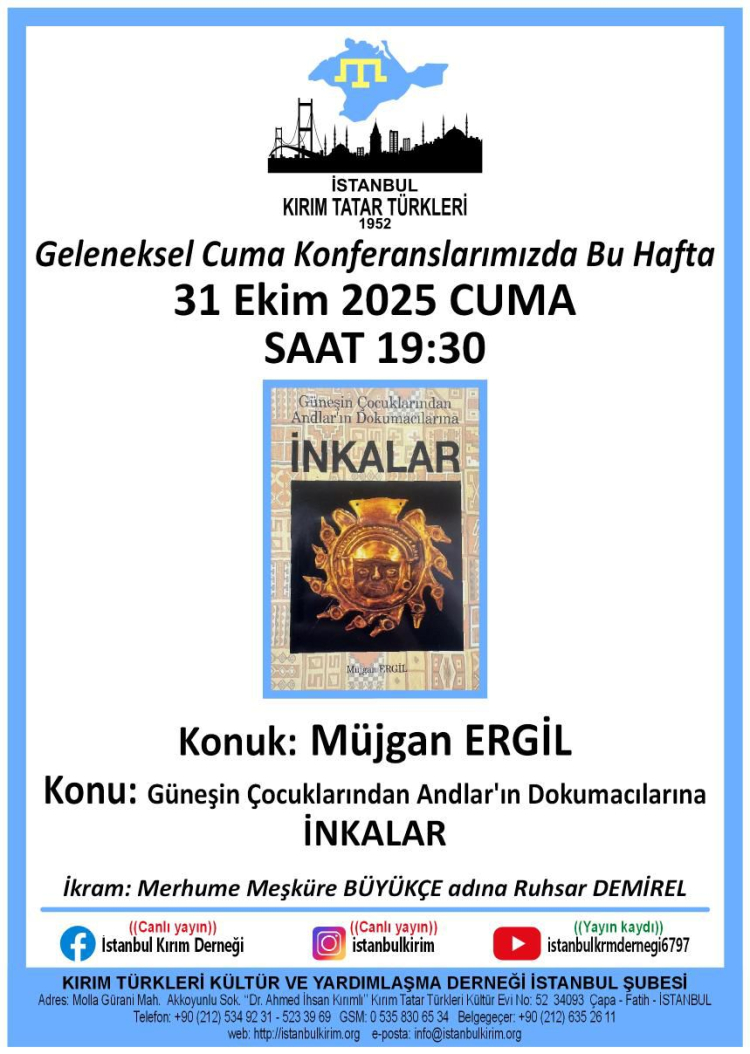 Kırım Derneği İstanbul Şubesi, 31 Ekim 2025 tarihinde Yazar Müjgan Ergil'ın konuşmacı olarak katılacağı “Güneşin Çocuklarından Andlar’ın Dokumacılarına İnkalar” konulu konferansa ev sahipliği yapacak.