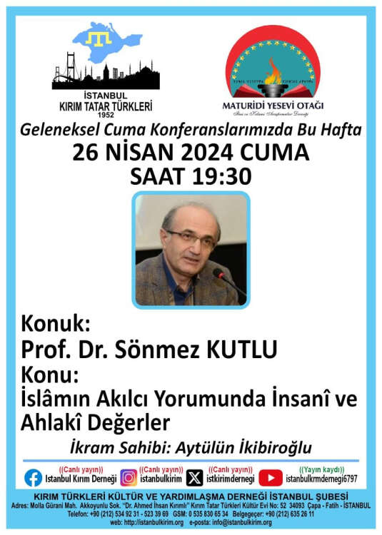 Kırım Türkleri Kültür ve Yardımlaşma Derneği İstanbul Şubesinin geleneksel olarak her hafta düzenlediği konferanslarda bu hafta "İslâmın Akılcı Yorumunda İnsanî ve Ahlakî Değerler" konusu işlenecek.