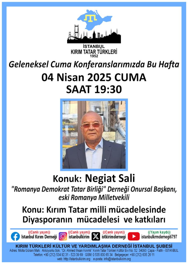 Romanya Demokrat Tatar Birliği Derneği Onursal Başkanı ve Romanya eski Milletvekili Negiat Sali'nin konuşmacı olarak katılacağı program, 4 Nisan 2025 Cuma günü saat 19.30'da Kırım Derneği İstanbul Şubesinde gerçekleştirilecek.