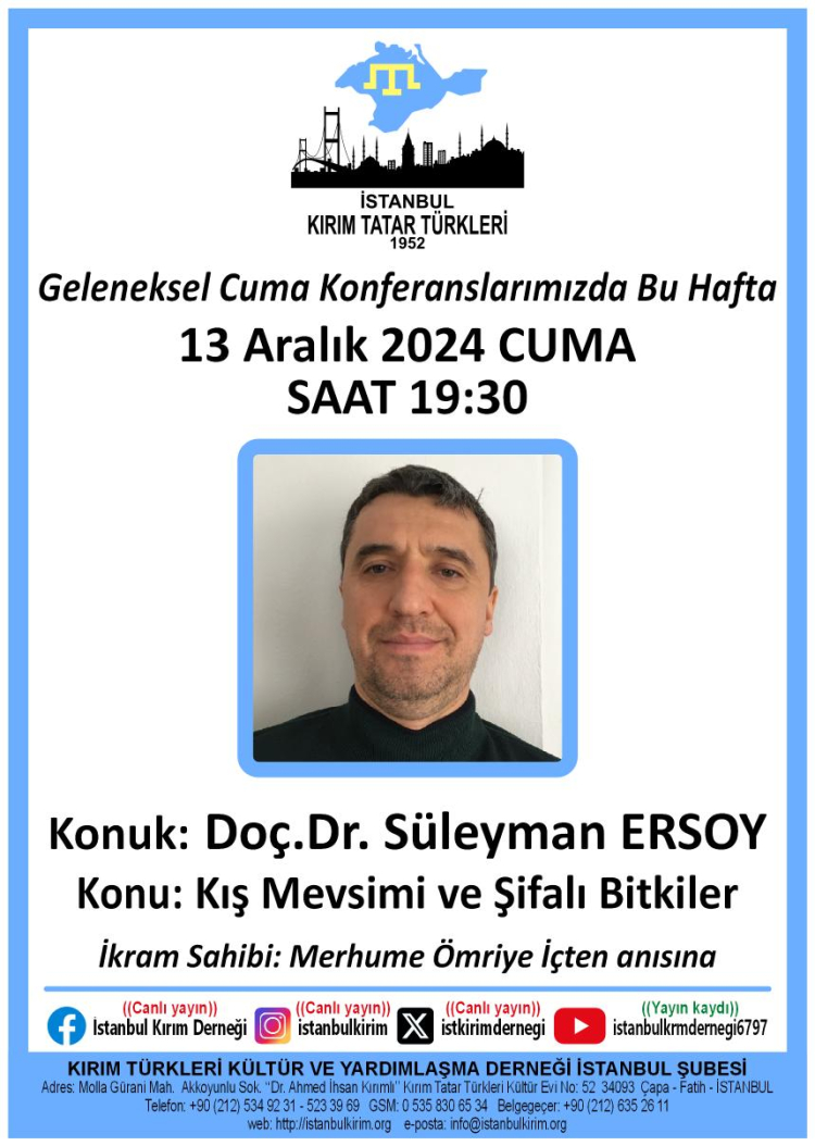Kırım Türkleri Kültür ve Yardımlaşma Derneği İstanbul Şubesinin "Geleneksel Cuma Konferansları" kapsamında 13 Aralık 2024 tarihi saat 19.30'da "Kış Mevsimi ve Şifalı Bitkiler" konuşulacak.