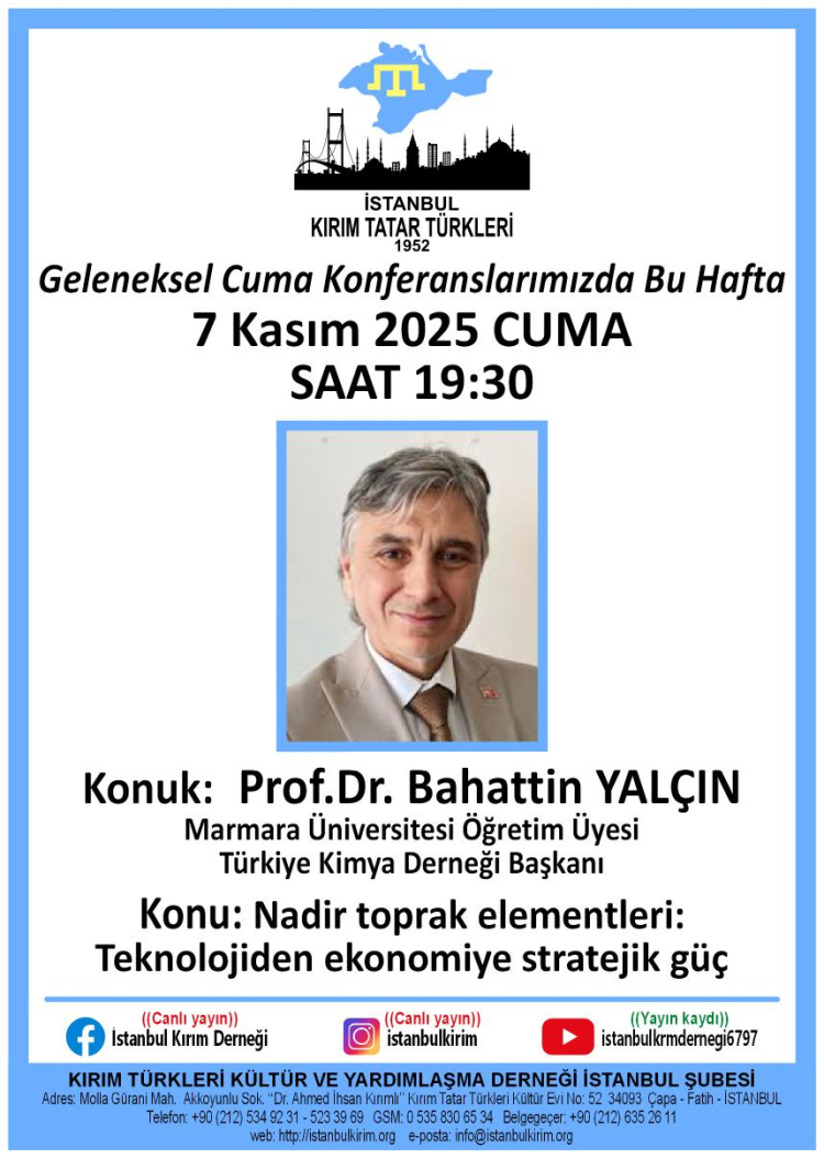 Kırım Derneği İstanbul Şubesi, 7 Kasım 2025 tarihinde Prof. Dr. Bahattin Yalçın'ın konuşmacı olarak katılacağı "Nadir Toprak Elementleri: Teknolojiden Ekonomiye Stratejik Güç" konulu konferansa ev sahipliği yapacak.