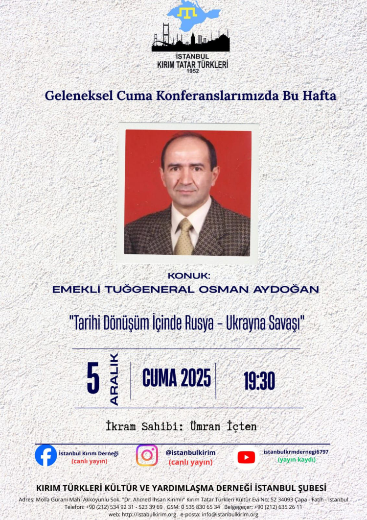 Kırım Derneği İstanbul Şubesi, 5 Aralık 2025 tarihinde Emekli Tuğgeneral Osman Aydoğan'ın konuşmacı olarak katılacağı "Tarihi Dönüşüm İçinde Rusya-Ukrayna Savaşı" konulu konferans tertip edecek.
