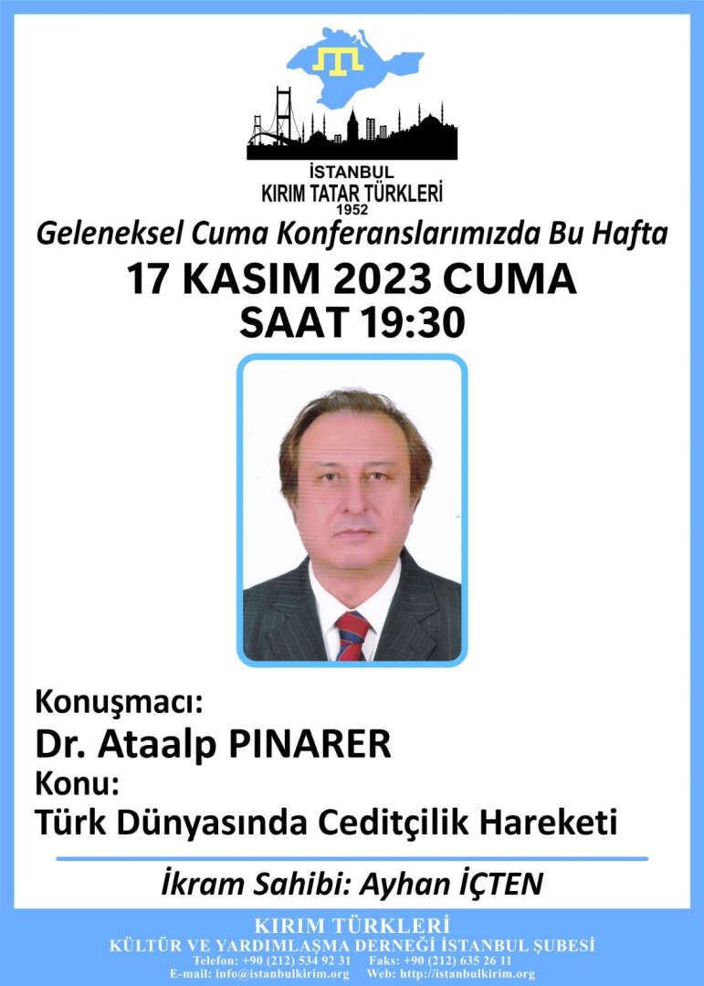Kırım Derneği İstanbul Şubesi, 17 Kasım 2023 Cuma günü Dr. Ataalp Pınarer'in konuşmacı olarak katılacağı "Türk Dünyasında Ceditçilik Hareketi" konulu konferansa ev sahipliği yapacak.